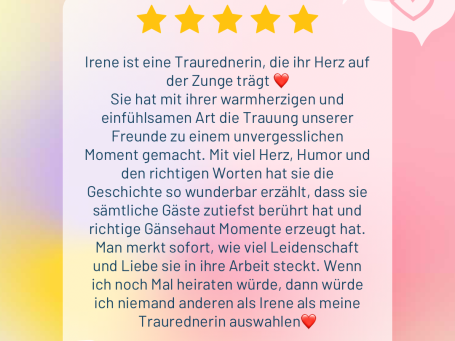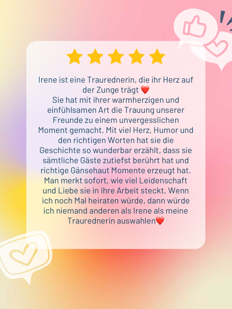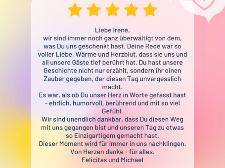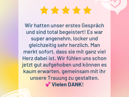 Aus all dem entsteht eure ganz persönliche Traurede: voller Gefühl, mit Gänsehaut-Momenten, Freudentränen und dem ein oder anderen Schmunzeln. Denn Liebe darf berühren, aber auch leicht und fröhlich sein.
